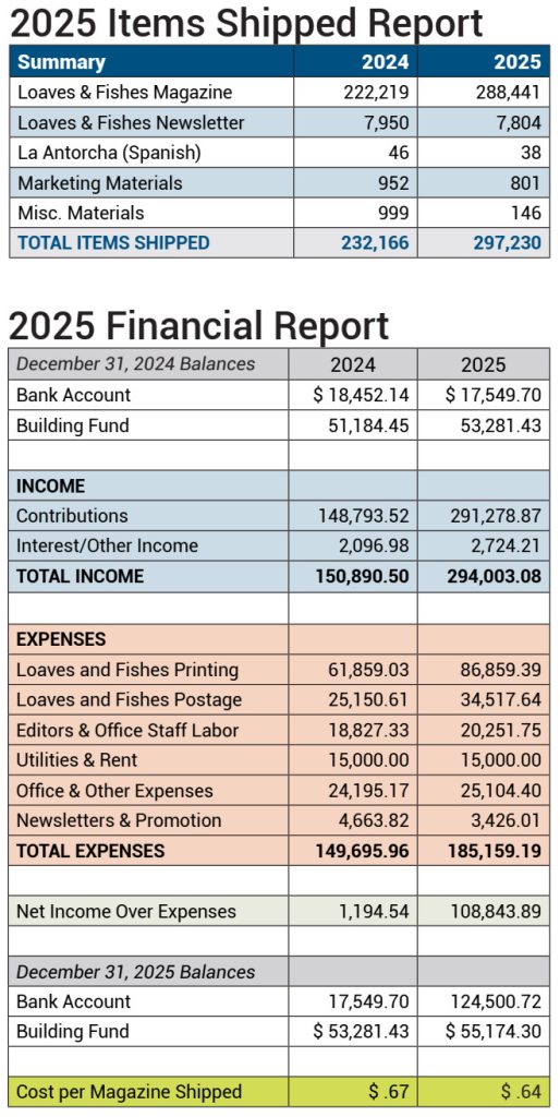 Loaves & Fishes Issue 58 is on track to ship in early March as planned. By the time you receive this newsletter, printing should be complete and the magazines should be on their way to our warehouse. This issue’s theme is Heaven. The content is designed to help readers reflect seriously on the reality of eternal life after our brief time here on earth ends.